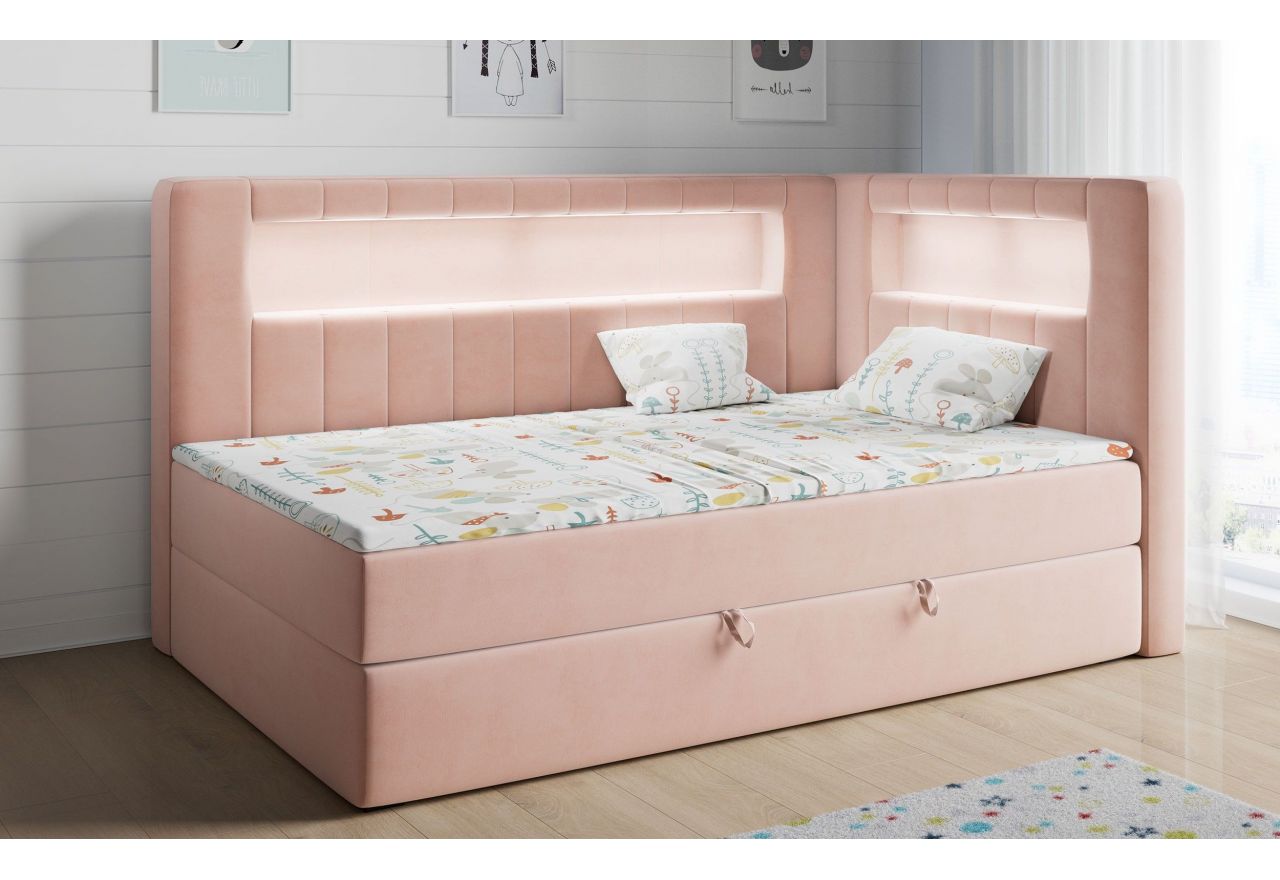 Główny materac kieszeniowy Pocket dostarcza doskonałego wsparcia dla ciała, dzięki wysokoelastycznej piance T-30 co jest kluczowe dla zdrowego snu. Jego konstrukcja z niezależnymi kieszeniami minimalizuje przenoszenie ruchu. Dodatkowo, materac nawierzchniowy wykończony pianką T-25 zapewnia uczucie miękkości i komfortu, dostosowując się do kształtu ciała. Pojemnik na pościel to praktyczne rozwiązanie, które pozwoli na łatwe przechowywanie pościeli i utrzymanie porządku. Automat na sprężynach sprawia, że otwieranie pojemnika jest wygodne i szybkie. Tapicerowany zagłówek razem z bokiem łóżka to prawdziwe ozdoby, które dodają wnętrzu klasy i stają się centralnym punktem każdej młodzieńczej sypialni. W wezgłowiu i boku znajduje się praktyczna wnęka z oświetleniem LED.