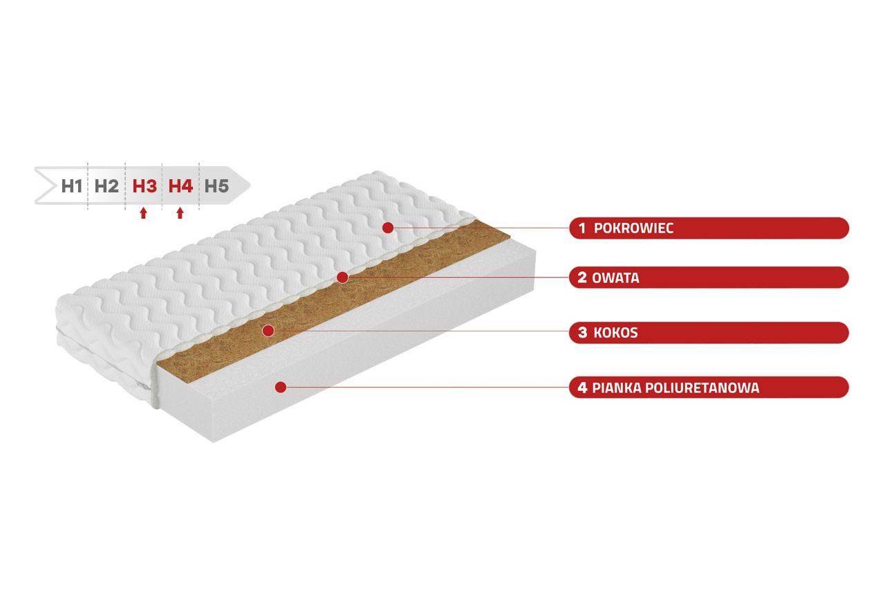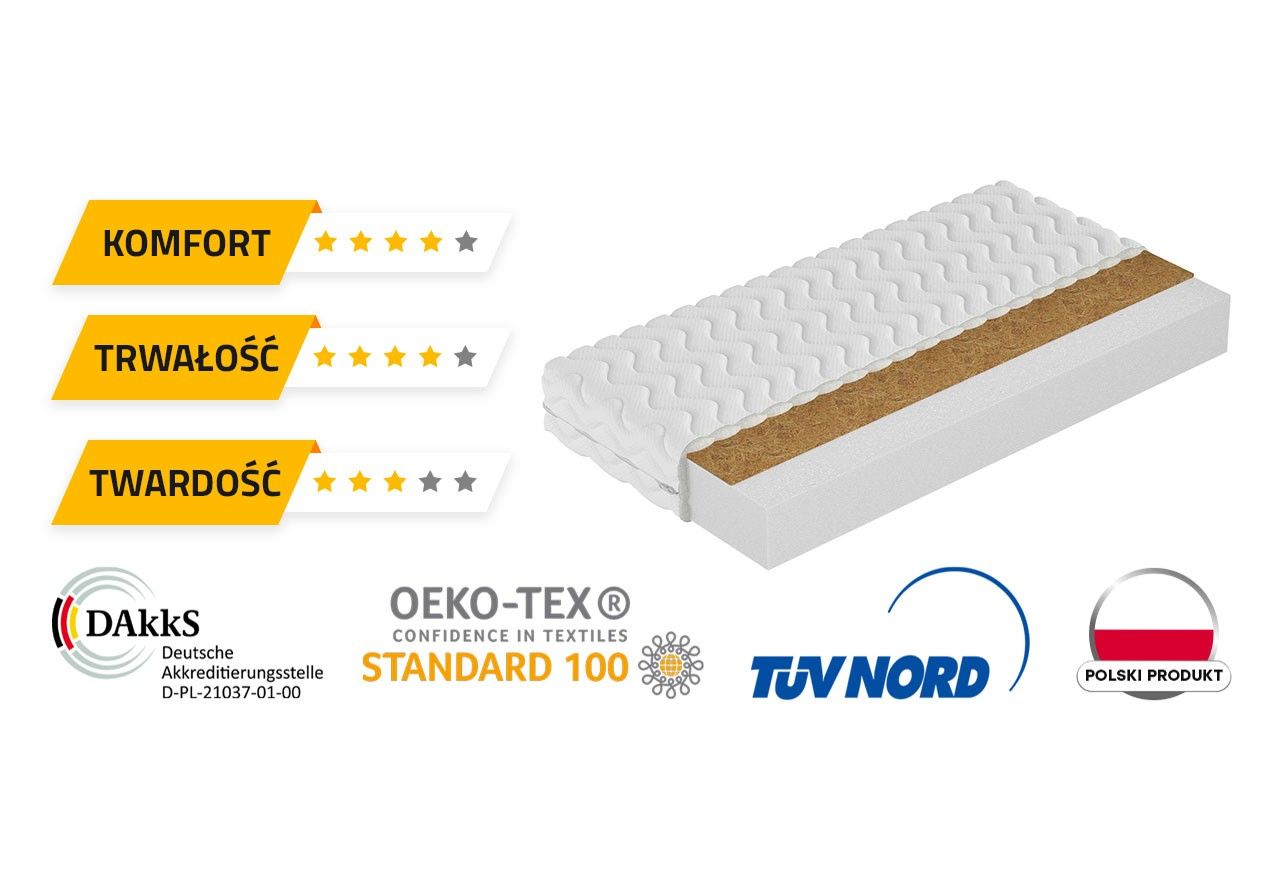 - Mata kokosowa (1 cm) - usztywnia materac, wchłania wilgoć, utrzymuje odpowiednią cyrkulację powietrza