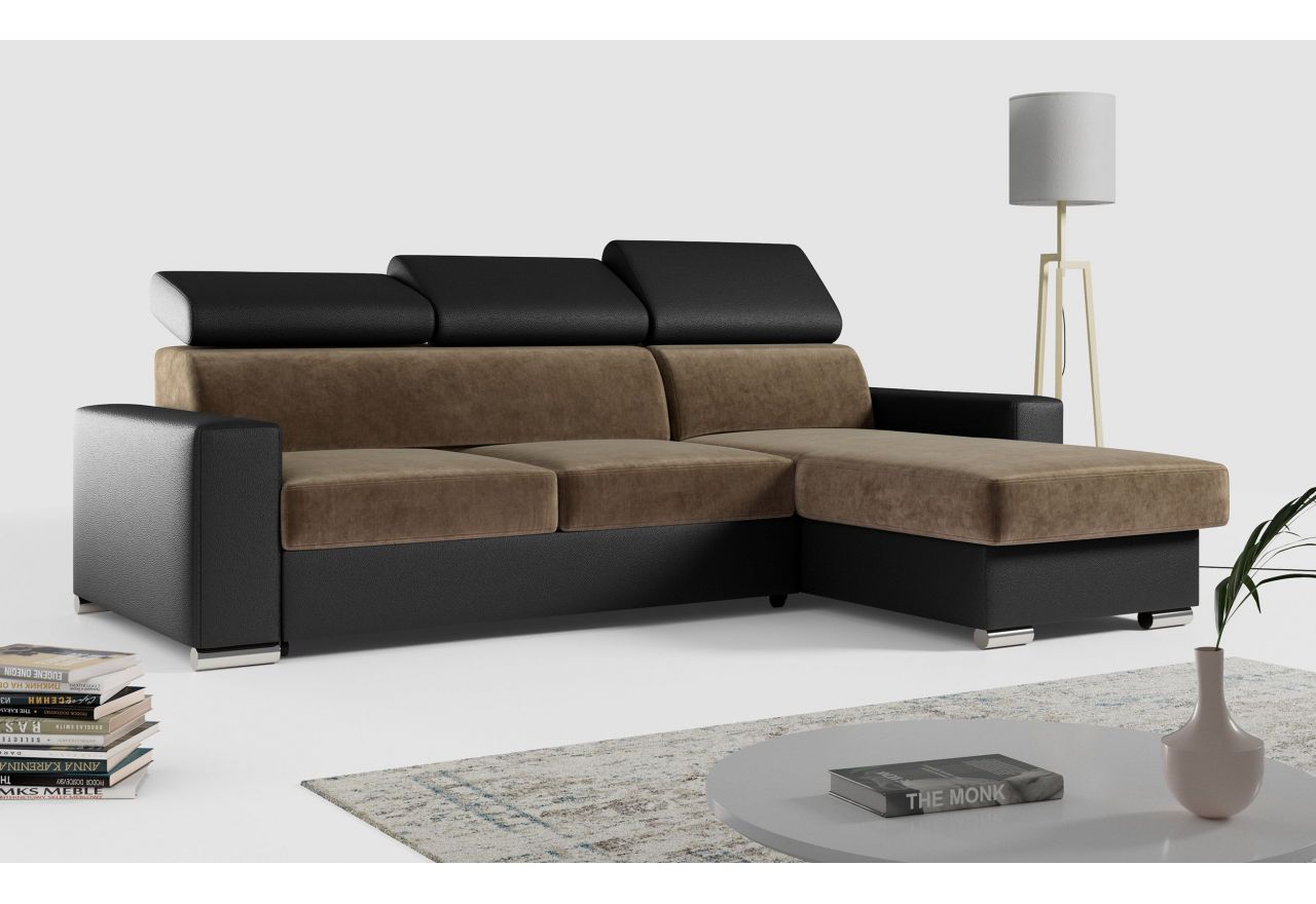 Konstrukcja narożnika opiera się na wysokiej jakości sprężynach oraz trwałej piance wysokoelastycznej T30, co zapewnia komfort użytkowania oraz odpowiednie podparcie. Narożnik posiada funkcję spania, umożliwiając szybkie i wygodne przekształcenie go w łóżko, co czyni go idealnym rozwiązaniem dla gości lub codziennego użytku. Dodatkowym atutem jest praktyczny pojemnik na pościel, który pomaga w utrzymaniu porządku i optymalnym wykorzystaniu przestrzeni. Automat na sprężynach sprawia, że otwieranie pojemnika jest wygodne i szybkie. Dzięki swojej funkcjonalności i estetycznemu designowi, stanowi harmonijne połączenie komfortu i praktyczności. Ze względu na swoją kompaktową konstrukcję doskonale pasuje zarówno do niewielkich, jak i przestronnych pomieszczeń, oferując komfortowe miejsce do relaksu.