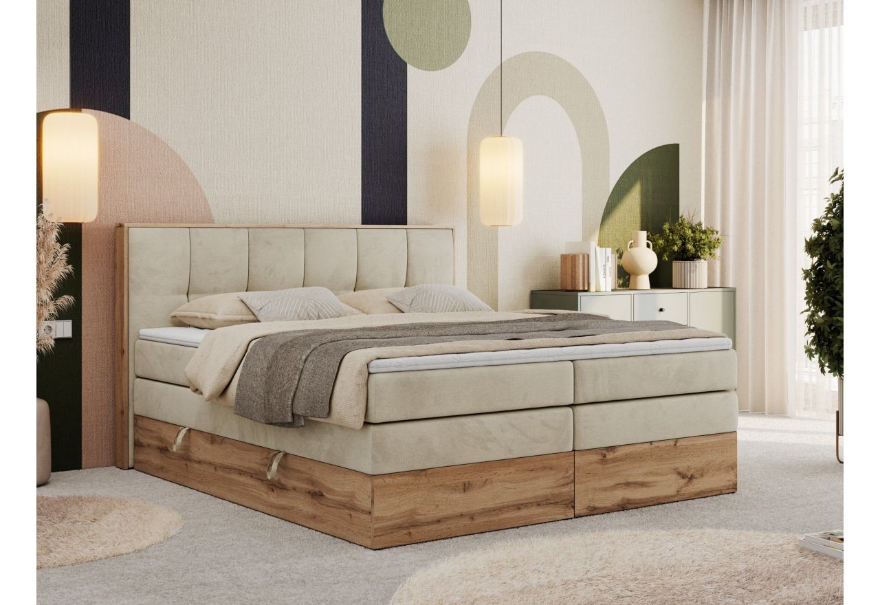 Główny materac kieszeniowy Multipocket dostarcza doskonałego wsparcia dla ciała, dzięki wysokoelastycznej piance T-30 co jest kluczowe dla zdrowego snu. Jego konstrukcja z niezależnymi kieszeniami minimalizuje przenoszenie ruchu. Dodatkowo, materac nawierzchniowy wykończony pianką T-25 zapewnia uczucie miękkości i komfortu, dostosowując się do kształtu ciała. Łóżko wyposażone w 2 poziomy materacy to rozwiązanie podnoszące znacząco komfort snu. Dwa pojemniki na pościel to praktyczne rozwiązanie, które pozwoli na łatwe przechowywanie pościeli i utrzymanie porządku. Automat na sprężynach sprawia, że otwieranie pojemników jest wygodne i szybkie. Łóżko kontynentalne posiada drewniane wykończenie na skrzyni oraz ramie wezgłowia. Dodaje wnętrzu ciepła i stylu, a nowoczesny design sprawia, że idealnie wpisuje się w różnorodne aranżacje.