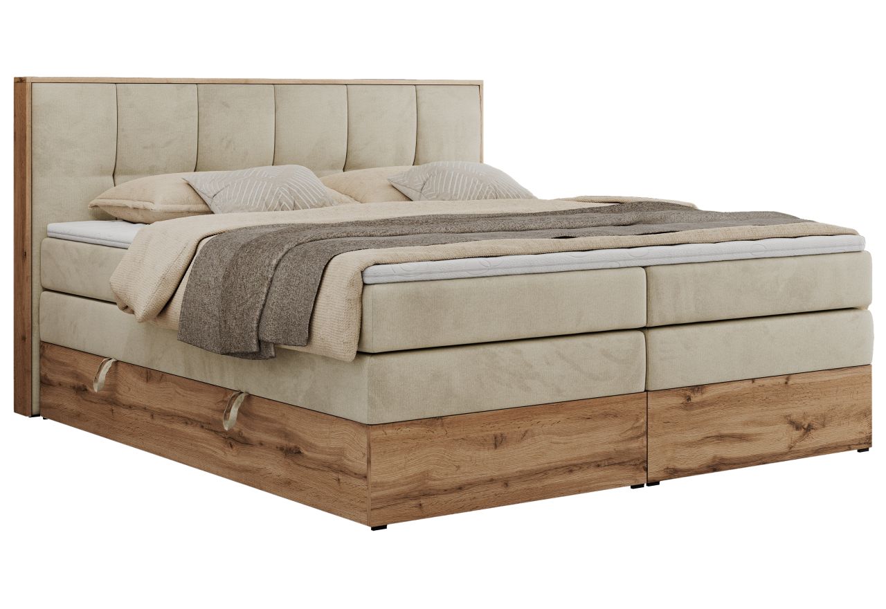 Główny materac kieszeniowy Multipocket dostarcza doskonałego wsparcia dla ciała, dzięki wysokoelastycznej piance T-30 co jest kluczowe dla zdrowego snu. Jego konstrukcja z niezależnymi kieszeniami minimalizuje przenoszenie ruchu. Dodatkowo, materac nawierzchniowy wykończony pianką T-25 zapewnia uczucie miękkości i komfortu, dostosowując się do kształtu ciała. Łóżko wyposażone w 2 poziomy materacy to rozwiązanie podnoszące znacząco komfort snu. Dwa pojemniki na pościel to praktyczne rozwiązanie, które pozwoli na łatwe przechowywanie pościeli i utrzymanie porządku. Automat na sprężynach sprawia, że otwieranie pojemników jest wygodne i szybkie. Łóżko kontynentalne posiada drewniane wykończenie na skrzyni oraz ramie wezgłowia. Dodaje wnętrzu ciepła i stylu, a nowoczesny design sprawia, że idealnie wpisuje się w różnorodne aranżacje.