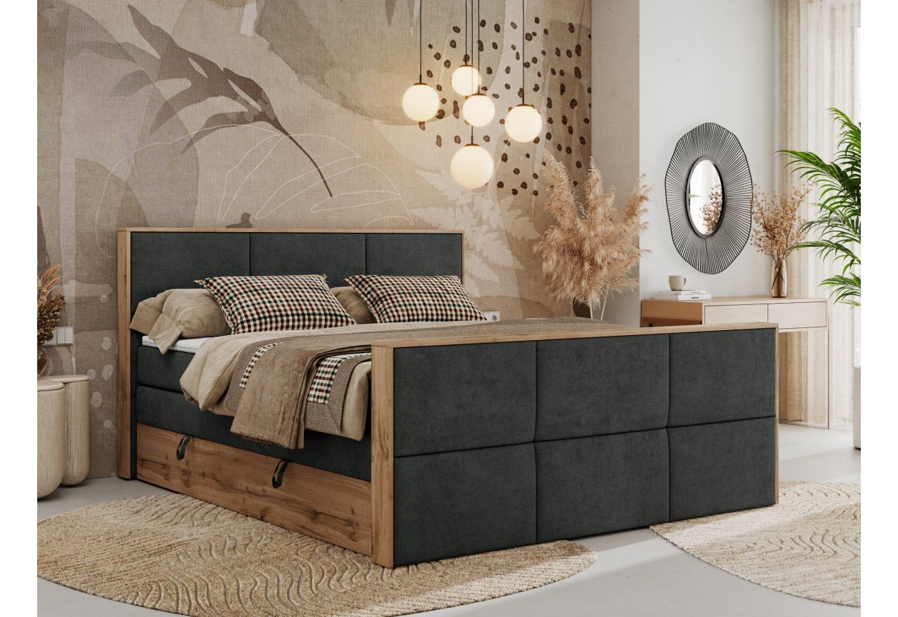 Główny materac kieszeniowy Multipocket dostarcza doskonałego wsparcia dla ciała, dzięki wysokoelastycznej piance T-30 co jest kluczowe dla zdrowego snu. Jego konstrukcja z niezależnymi kieszeniami minimalizuje przenoszenie ruchu. Dodatkowo, materac nawierzchniowy wykończony pianką T-25 zapewnia uczucie miękkości i komfortu, dostosowując się do kształtu ciała. Łóżko wyposażone w 2 poziomy materacy to rozwiązanie podnoszące znacząco komfort snu. Dwa pojemniki na pościel to praktyczne rozwiązanie, które pozwoli na łatwe przechowywanie pościeli i utrzymanie porządku. Automat na sprężynach sprawia, że otwieranie pojemników jest wygodne i szybkie. Łóżko kontynentalne posiada drewniane wykończenie na skrzyni oraz ramie wezgłowia. Dodaje wnętrzu ciepła i stylu, a nowoczesny design sprawia, że idealnie wpisuje się w różnorodne aranżacje.