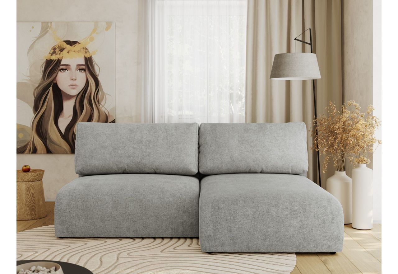 Konstrukcja narożnika opiera się na wysokiej jakości sprężynach falistych oraz trwałej piance CME35/45, co zapewnia optymalne podparcie i komfort użytkowania. Narożnik posiada funkcję spania z mechanizmem DL, dzięki czemu można go łatwo przekształcić w wygodne łóżko – idealne dla gości lub codziennego odpoczynku. Luźne poduszki oparciowe można szybko usunąć, co dodatkowo ułatwia korzystanie z funkcji spania.