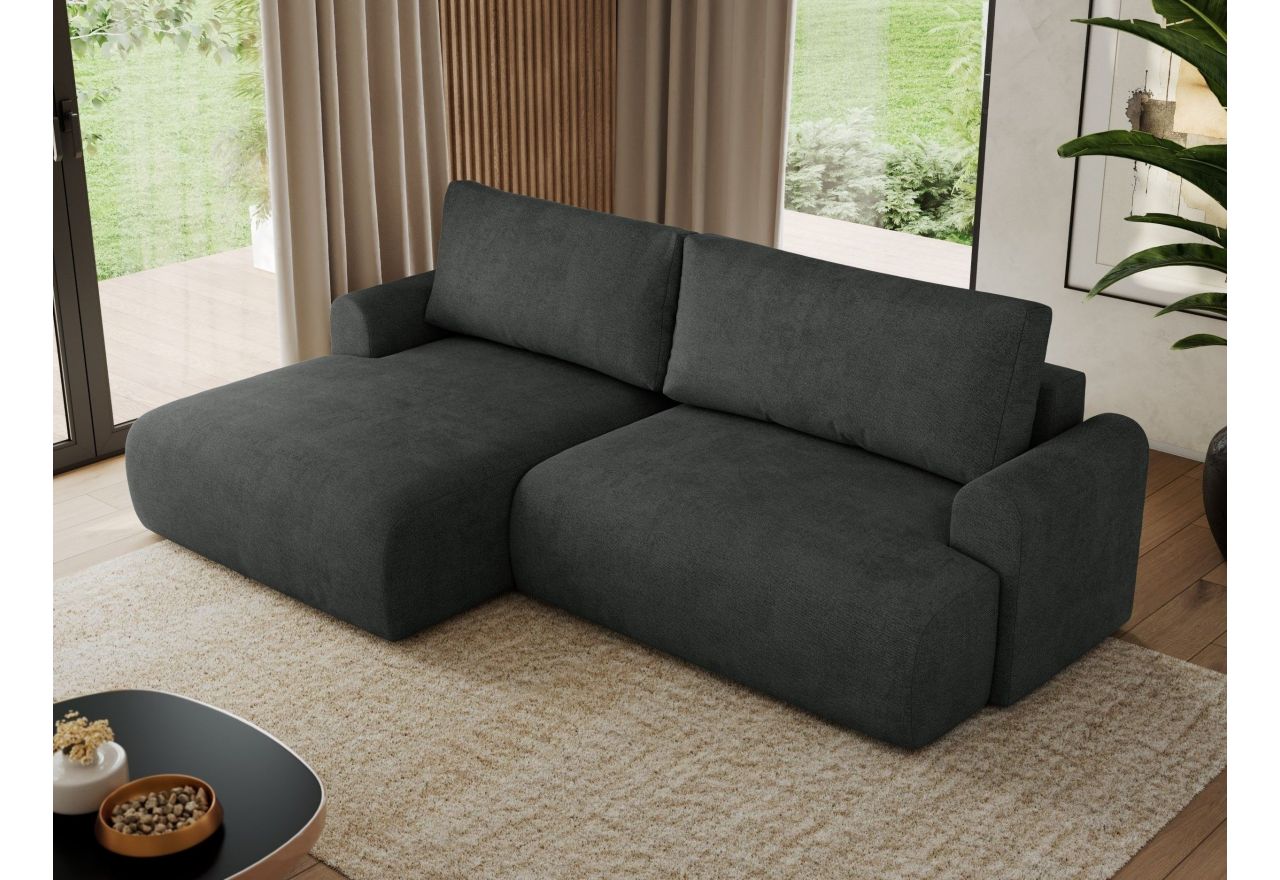Konstrukcja narożnika opiera się na wysokiej jakości sprężynach falistych oraz trwałej piance CME35/45, co zapewnia komfort użytkowania oraz odpowiednie podparcie ciała. Narożnik posiada funkcję spania z mechanizmem DL, umożliwiając szybkie i wygodne przekształcenie go w przestronne łóżko – idealne dla gości lub codziennego użytku. Dodatkowym atutem jest praktyczny pojemnik na pościel, który ułatwia przechowywanie i pomaga w utrzymaniu porządku.