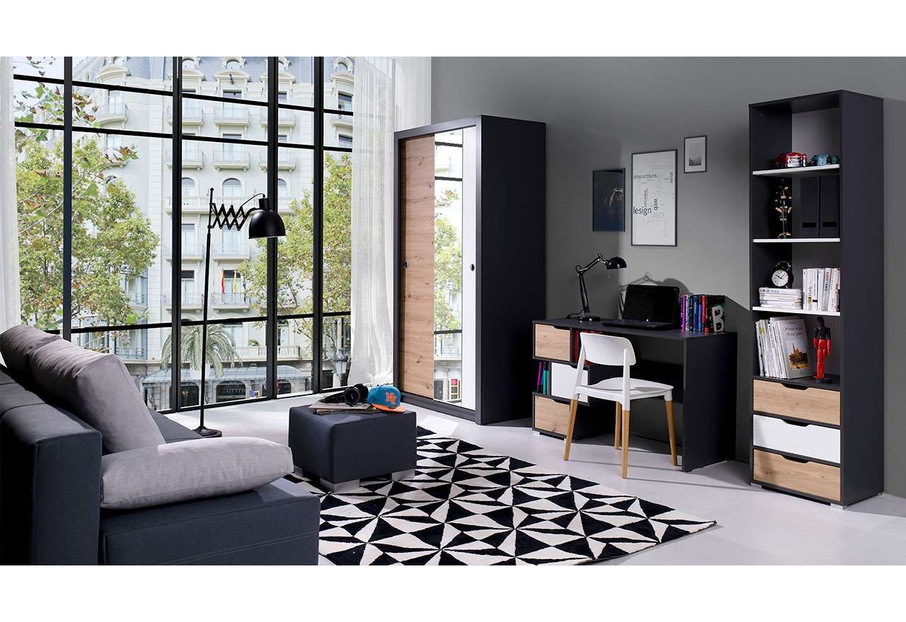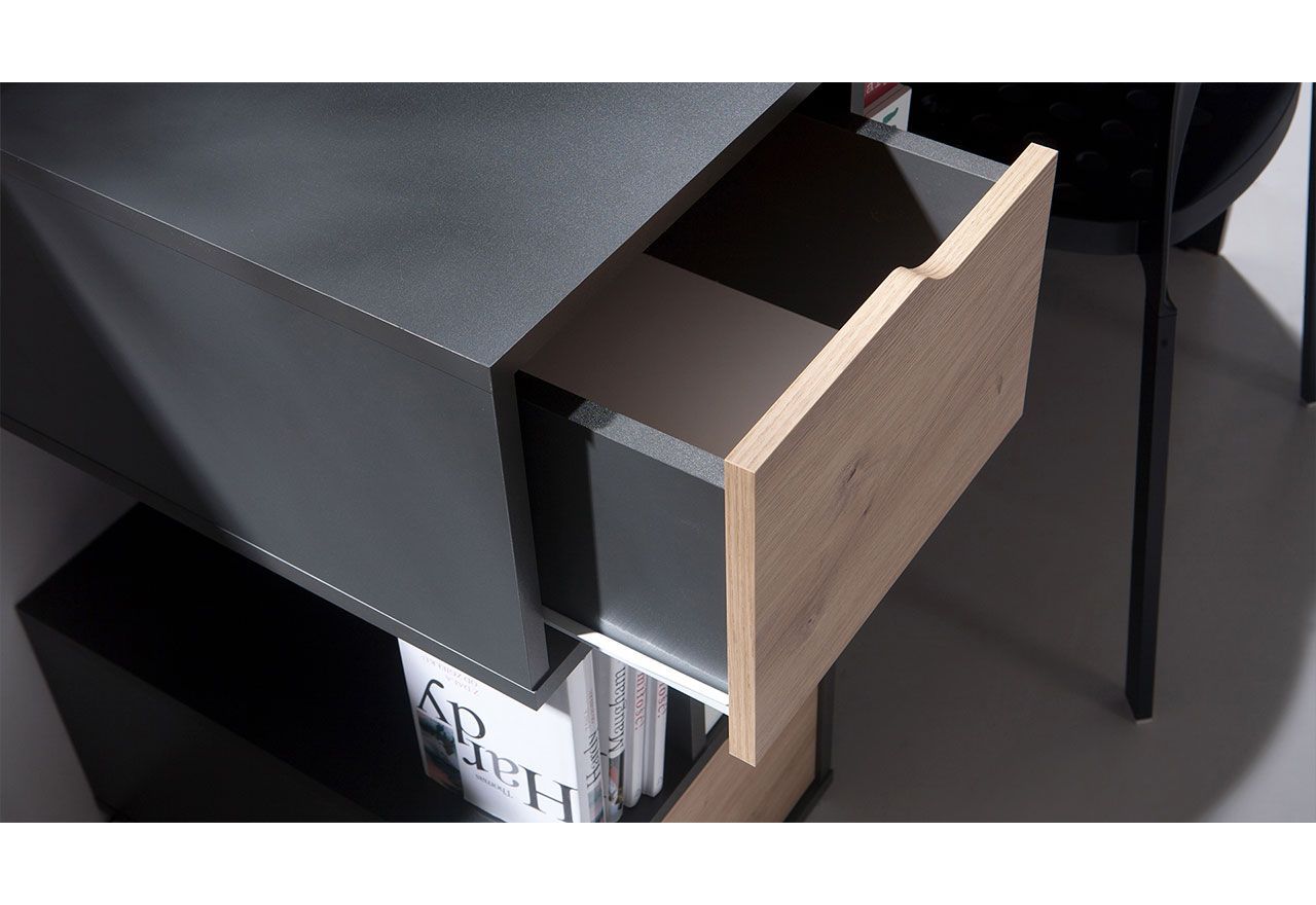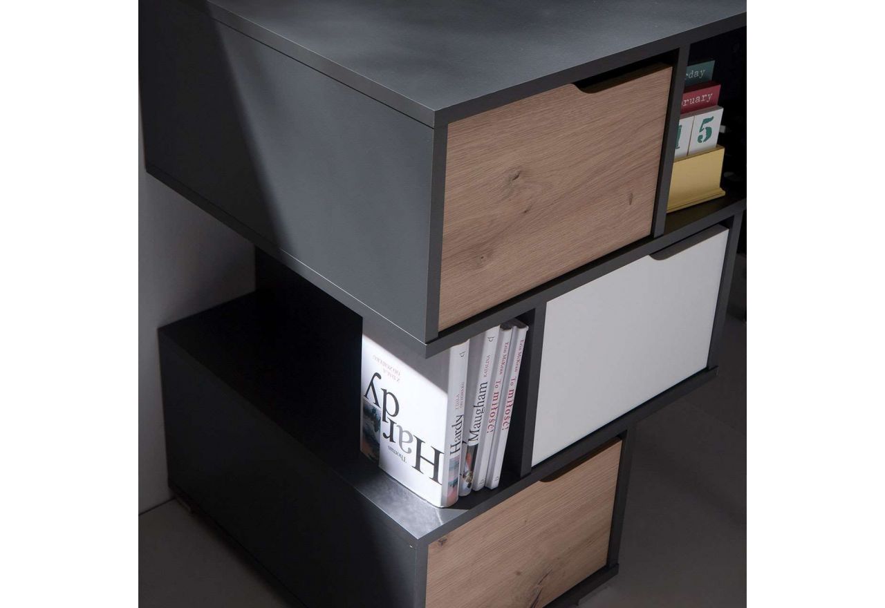 Poprzedni arrow_back_ios_newNastępny arrow_forward_iosNowoczesne młodzieżowe biurko komputerowe z pojemnymi szufladami - GETA - Grafit / Biały / Dąb Artisan