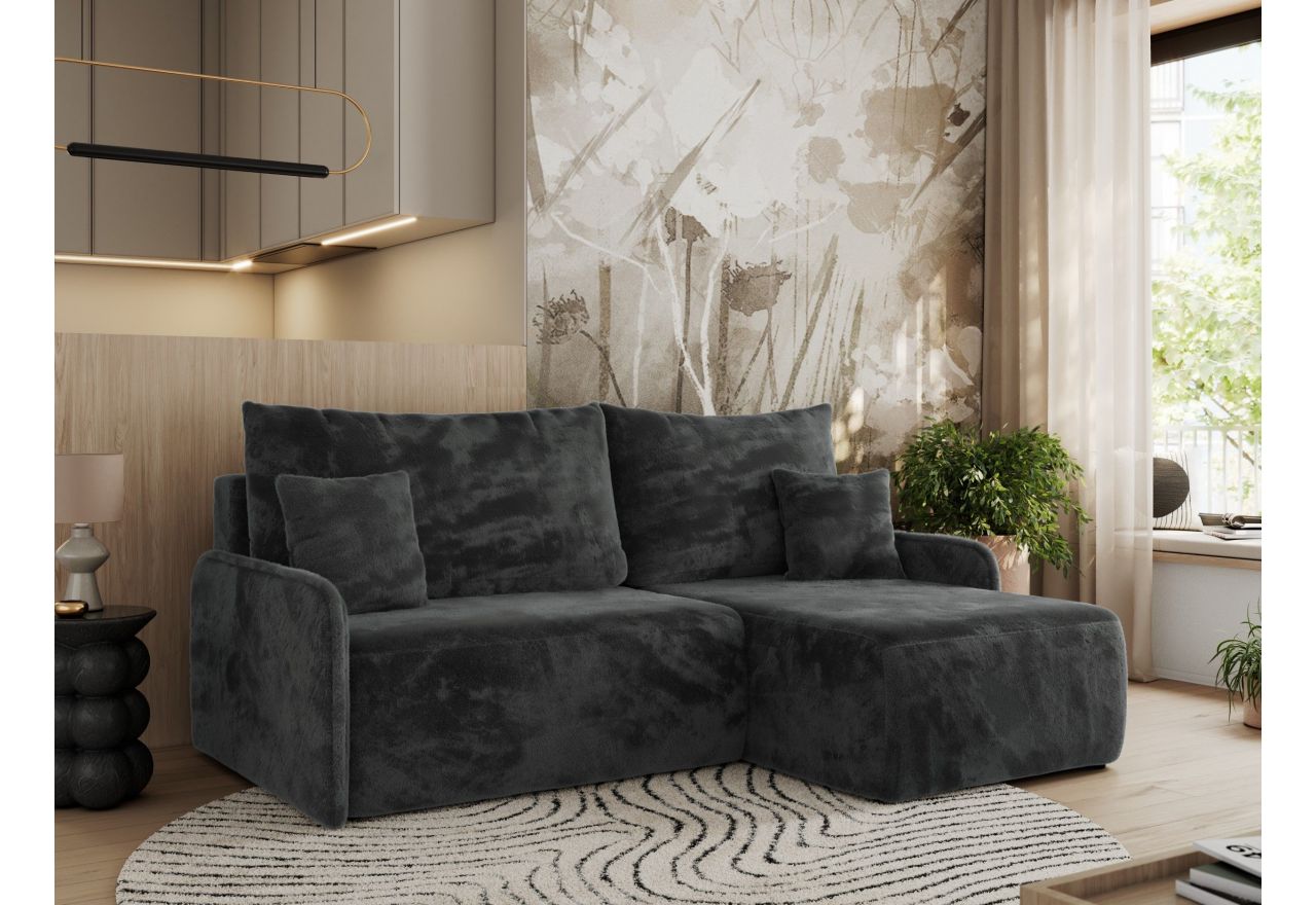 Konstrukcja narożnika opiera się na wysokiej jakości sprężynach falistych oraz trwałej piance wysokoelastycznej CME30, co zapewnia wyjątkowy komfort zarówno podczas siedzenia, jak i spania. Dzięki funkcji spania i łatwemu w obsłudze mechanizmowi DL, narożnik można szybko przekształcić w wygodne łóżko. Dodatkowo, praktyczny pojemnik na pościel umożliwia przechowywanie kołder, poduszek czy innych akcesoriów, pomagając zachować porządek w salonie.