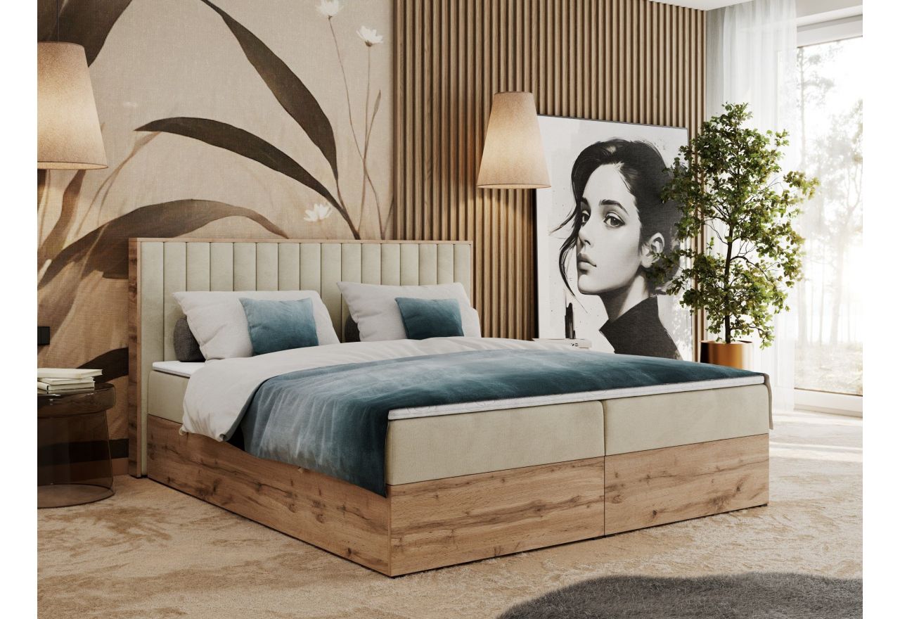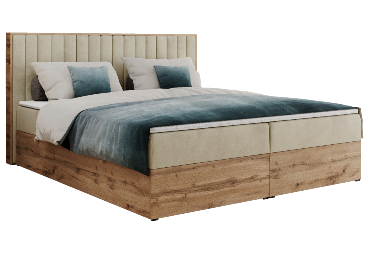 Główny materac kieszeniowy Multipocket dostarcza doskonałego wsparcia dla ciała, dzięki wysokoelastycznej piance T-30 co jest kluczowe dla zdrowego snu. Jego konstrukcja z niezależnymi kieszeniami minimalizuje przenoszenie ruchu. Dodatkowo, materac nawierzchniowy wykończony pianką T-25 zapewnia uczucie miękkości i komfortu, dostosowując się do kształtu ciała. Dwa pojemniki na pościel to praktyczne rozwiązanie, które pozwoli na łatwe przechowywanie pościeli i utrzymanie porządku. Automat na sprężynach sprawia, że otwieranie pojemników jest wygodne i szybkie. Tapicerowany zagłówek to prawdziwa ozdoba, która dodaje wnętrzu klasy i staje się centralnym punktem każdej sypialni. Łóżko kontynentalne posiada drewniane wykończenie na skrzyni oraz ramie wezgłowia. Dodaje wnętrzu ciepła i stylu, a nowoczesny design sprawia, że idealnie wpisuje się w różnorodne aranżacje.
