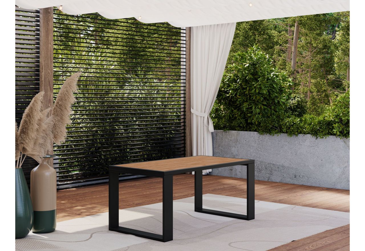 Solidna metalowa rama w kolorze czarnym zapewnia stabilność i wytrzymałość, a zastosowanie wysokiej jakości materiałów gwarantuje odporność na zmienne warunki atmosferyczne. Stół jest łatwy w pielęgnacji, co sprawia, że zachowa swój wygląd przez długi czas.