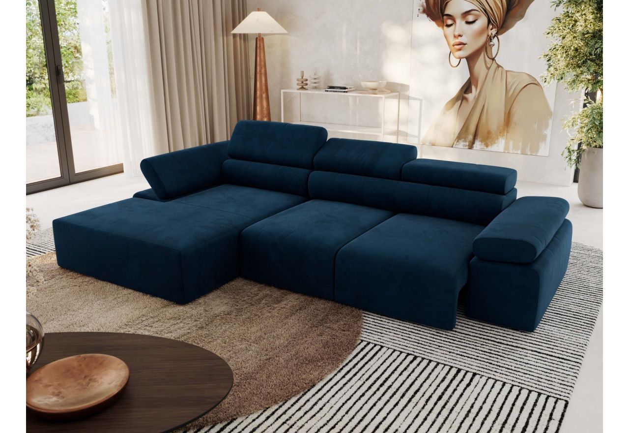 Model dostępny jest w wersji lewej lub prawej, co pozwala idealnie dopasować go do układu wnętrza. L-kształtna forma i elegancka linia sprawiają, że narożnik doskonale prezentuje się w każdym salonie. Regulowane zagłówki i podłokietniki umożliwiają indywidualne ustawienie pozycji do czytania, oglądania telewizji lub relaksu.