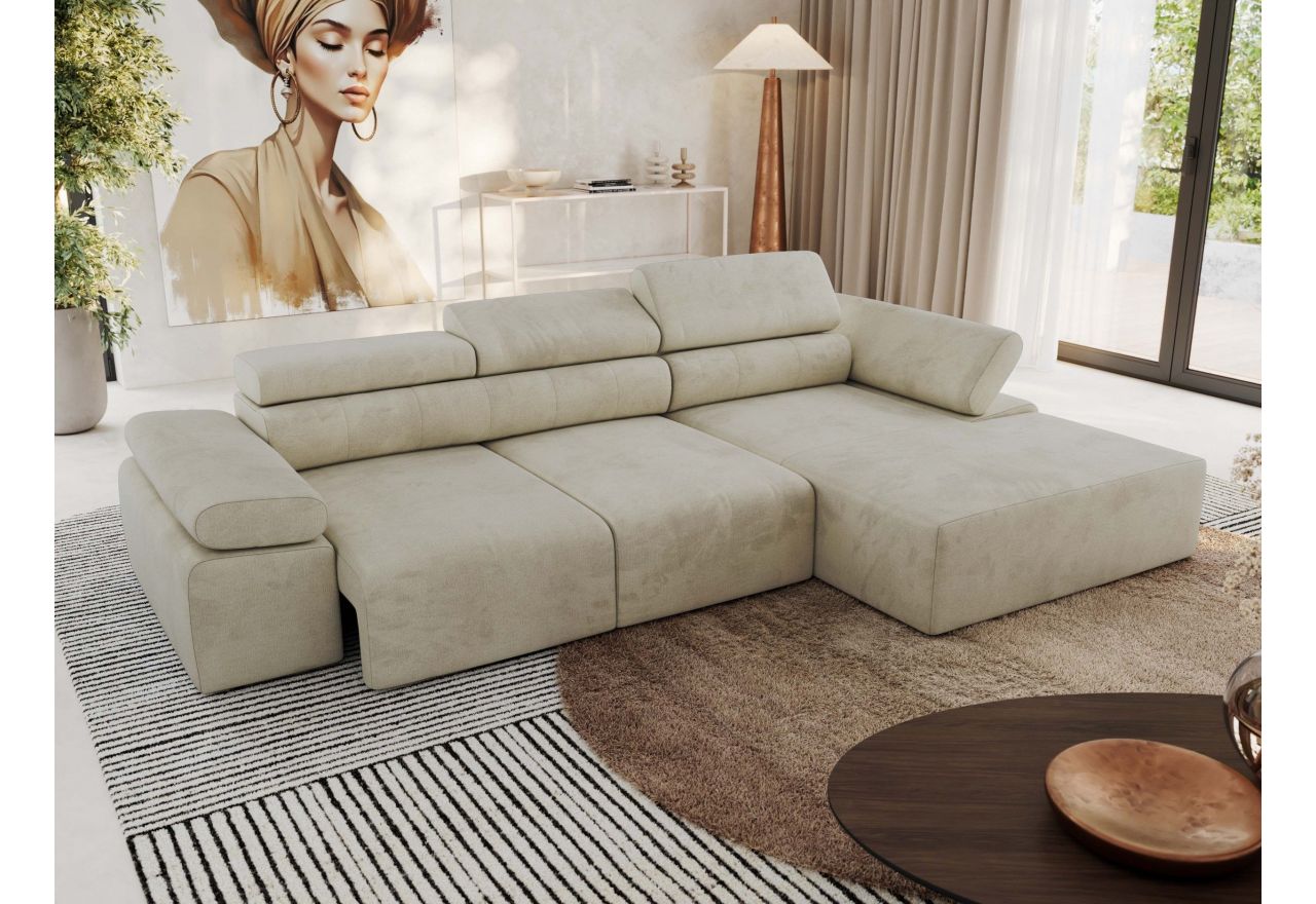 Model dostępny jest w wersji lewej lub prawej, co pozwala idealnie dopasować go do układu wnętrza. L-kształtna forma i elegancka linia sprawiają, że narożnik doskonale prezentuje się w każdym salonie. Regulowane zagłówki i podłokietniki umożliwiają indywidualne ustawienie pozycji do czytania, oglądania telewizji lub relaksu.