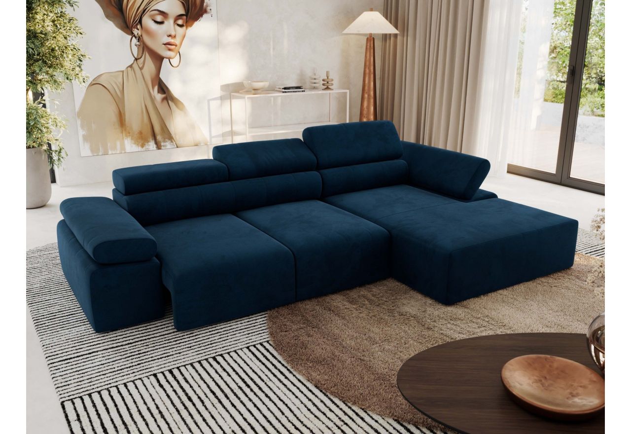 Model dostępny jest w wersji lewej lub prawej, co pozwala idealnie dopasować go do układu wnętrza. L-kształtna forma i elegancka linia sprawiają, że narożnik doskonale prezentuje się w każdym salonie. Regulowane zagłówki i podłokietniki umożliwiają indywidualne ustawienie pozycji do czytania, oglądania telewizji lub relaksu.