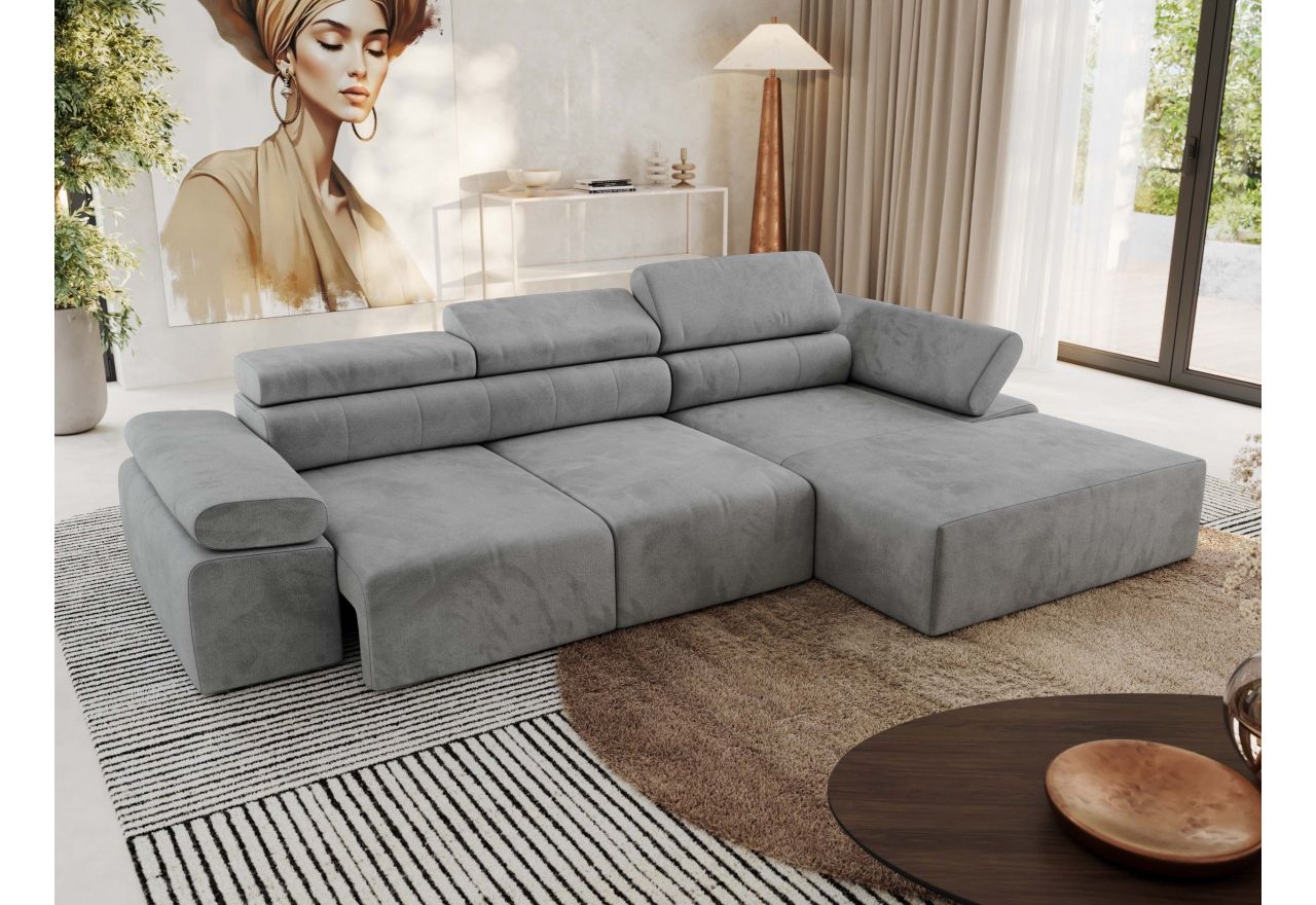 Model dostępny jest w wersji lewej lub prawej, co pozwala idealnie dopasować go do układu wnętrza. L-kształtna forma i elegancka linia sprawiają, że narożnik doskonale prezentuje się w każdym salonie. Regulowane zagłówki i podłokietniki umożliwiają indywidualne ustawienie pozycji do czytania, oglądania telewizji lub relaksu.