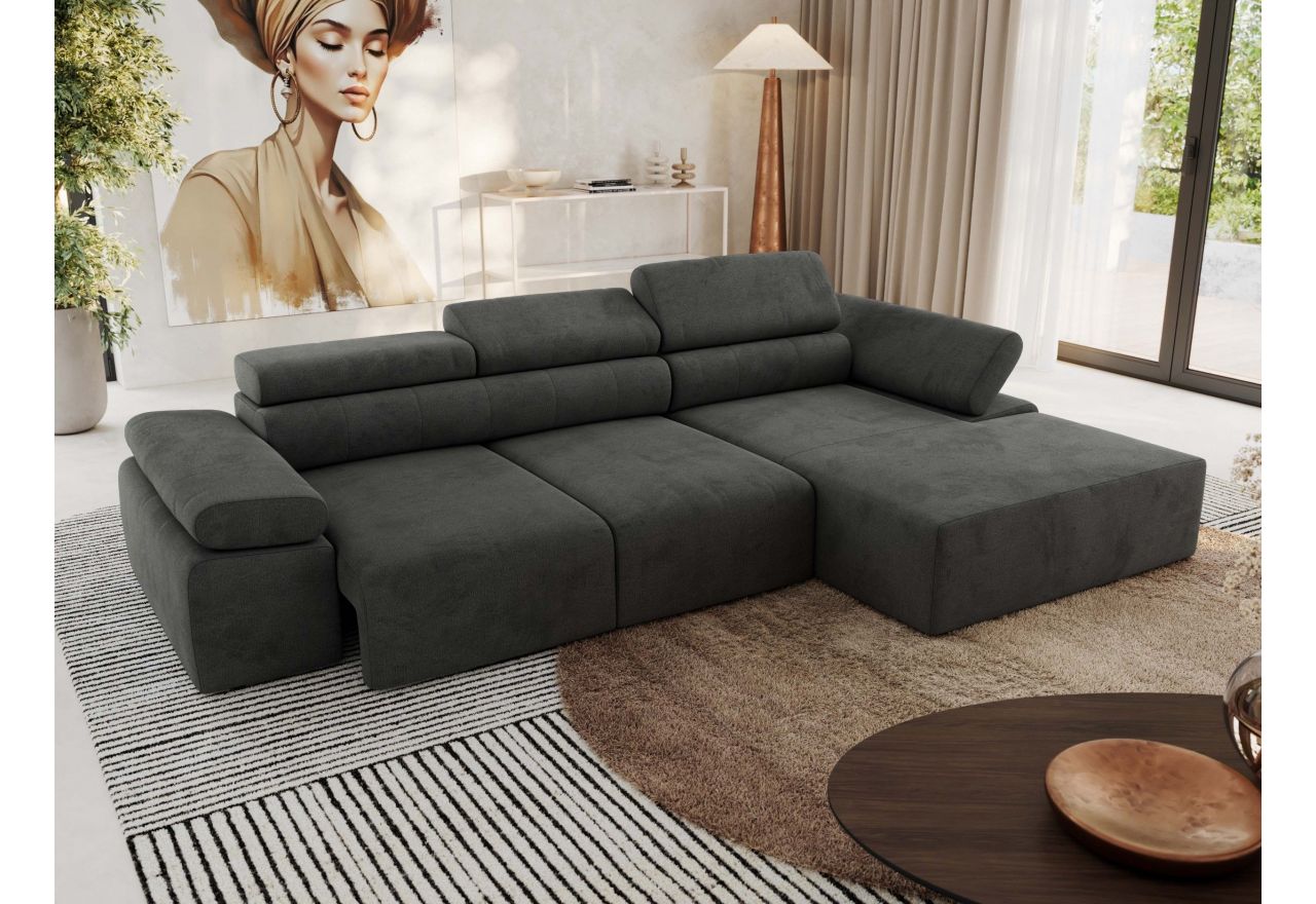 Model dostępny jest w wersji lewej lub prawej, co pozwala idealnie dopasować go do układu wnętrza. L-kształtna forma i elegancka linia sprawiają, że narożnik doskonale prezentuje się w każdym salonie. Regulowane zagłówki i podłokietniki umożliwiają indywidualne ustawienie pozycji do czytania, oglądania telewizji lub relaksu.