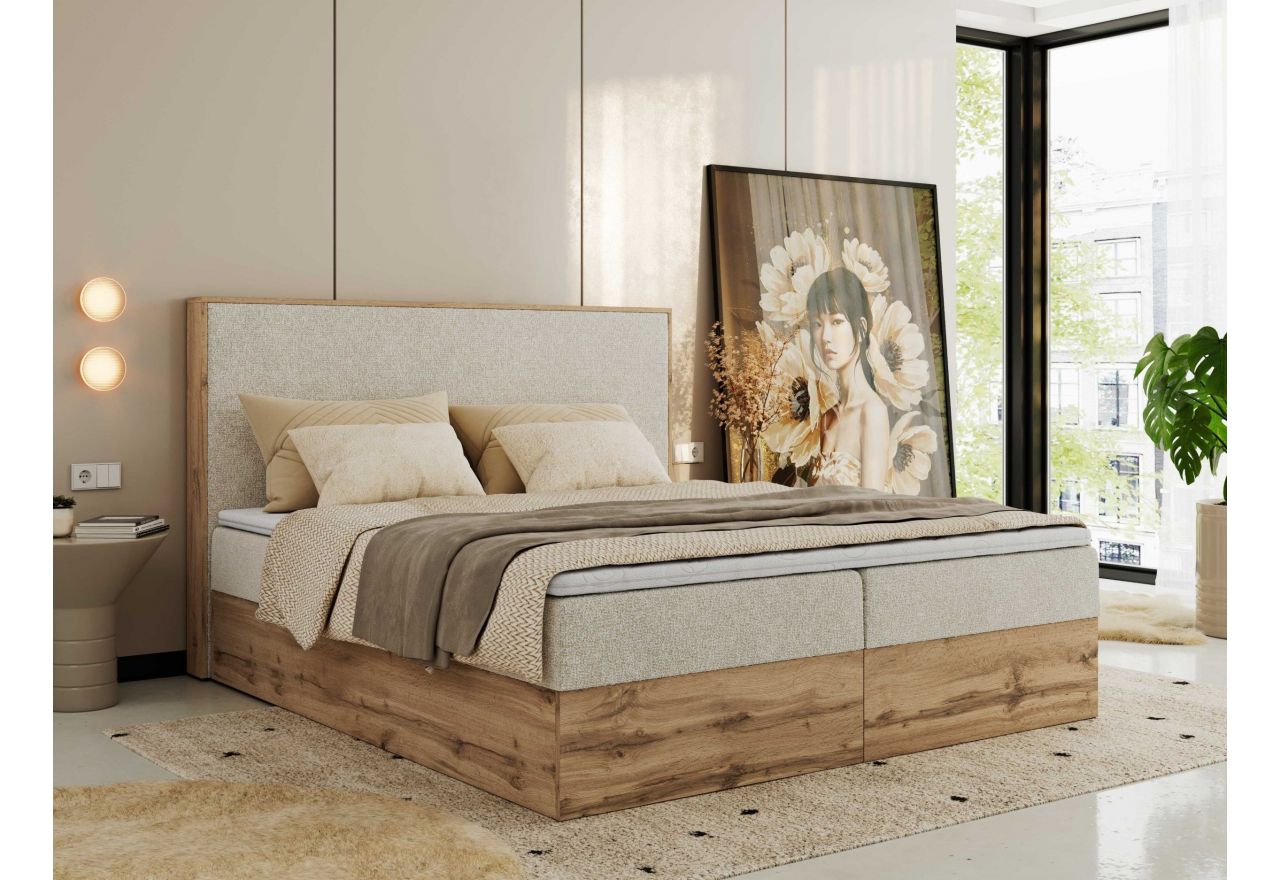 Dwa pojemniki na pościel to praktyczne rozwiązanie ułatwiające przechowywanie – otwierane są za pomocą sprężynowego automatu, co sprawia, że dostęp do ich zawartości jest prosty i wygodny. Drewniane wykończenia w ciepłym odcieniu nadają łóżku naturalnego uroku i idealnie wpisują się w nowoczesne oraz klasyczne aranżacje wnętrz.