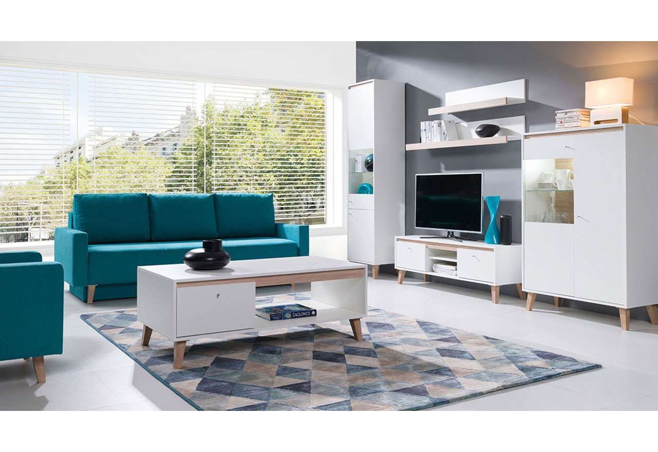 Styl skandynawski jest Twoim ulubionym? Jeżeli tak to dobrze trafiłeś. System mebli LUGO stworzony z myślą do pokoju dziennego oraz salonu. Prostota wykonania oraz minimalizm połączony z białym kolorem. Cechą wyróżniającą kolekcję są wysokie nóżki wykonane z tworzywa sztucznego w dębowych kolorach oraz małe uchwyty. Zestaw wykonany został w dwóch wariantach kolorystycznych: korpus i front w białym kolorze, a wstawki i nogi dąb san remo jasny oraz białe fronty, a korpus, wstawki i nogi dąb san remo ciemny. W skład zestawu wchodzą: witryny, komody, stolik kawowy, szafka RTV, szafa oraz półki. Dodatkowo witryny można wyposażyć w oświetlenie LED. Szuflady w bryłach zostały wyposażone w prowadnice rolkowe, które podnoszą komfort użytkowania. Płyta meblowa z jakiej została wykonana cała kolekcja, zabezpieczona jest dodatkowo okleiną ABS. Do mebli tapicerowanych zostały dobrane trzy kolory, tak aby każdy z miłośników skandynawskiego stylu wybrał coś dla siebie. Tkanina w jakiej został wykonany fotel, narożnik oraz pufa jest przyjemna w dotyku oraz świetnie sprawdzi się w nowoczesnych aranżacjach. Kolekcja LUGO to komfort użytkowania i estetycznie wykonane bryły.