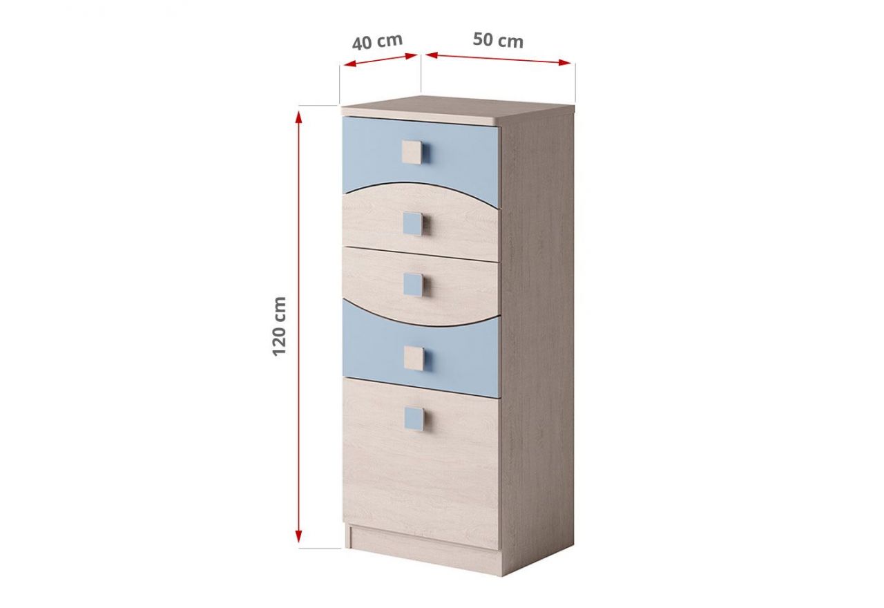 Kolekcja TUNGA to idealny wybór, jeśli zamierzasz wyposażyć pokój dziecka w nowe, pełne kolorów meble! Jasne, żywe akcenty wprowadzą do pomieszczenia radosny nastrój. Proste bryły oraz ciekawa, żywa kolorystyka to cechy przyciągające wzrok rodziców i nastolatków. Nadają przestrzeni oryginalnego designu, którego każdy może pozazdrościć. Komoda z pięcioma szufladami to świetny mebel, aby uporządkować przestrzeń wokół siebie. Wysoka na 120 cm komoda to łatwy dostęp. Schowaj mniejsze rzeczy, biżuterię czy drobiazgi. Zaokrąglony wzór frontów i wstawek wyróżnia się na tle innych mebli. Prosta forma i świetnie skomponowane kolory trafią w gusta Twojej pociechy. Charakterystyczne uchwyty z tworzywa sztucznego nadają niepowtarzalnego wyglądu i pięknie komponują się w całości. Dla zwiększenia wytrzymałości i trwałości mebla, obrzeża mebli wykończono okleiną ABS. Co więcej, krawędzie blatów mebli zostały zaokrąglone w trosce o bezpieczeństwo i przyjemną zabawę dziecka. Materiały wykorzystane do stworzenia mebli są z wyselekcjonowanej, wysokiej jakości płyty laminowanej 22 oraz 16 mm, która gwarantuje odporność na zarysowania, uszkodzenia oraz wilgoć. Okucia łączące elementy są wysokogatunkowe, więc masz pewność, że meble będą wieloletnie. Dla zwiększenia wytrzymałości i trwałości mebla, obrzeża mebli wykończono okleiną ABS. Do wszystkich szuflad w kolekcji użyto solidnych prowadnic rolkowych. Stwórz dla swojego dziecka doskonałą kompozycję z kolekcją TUNGA!