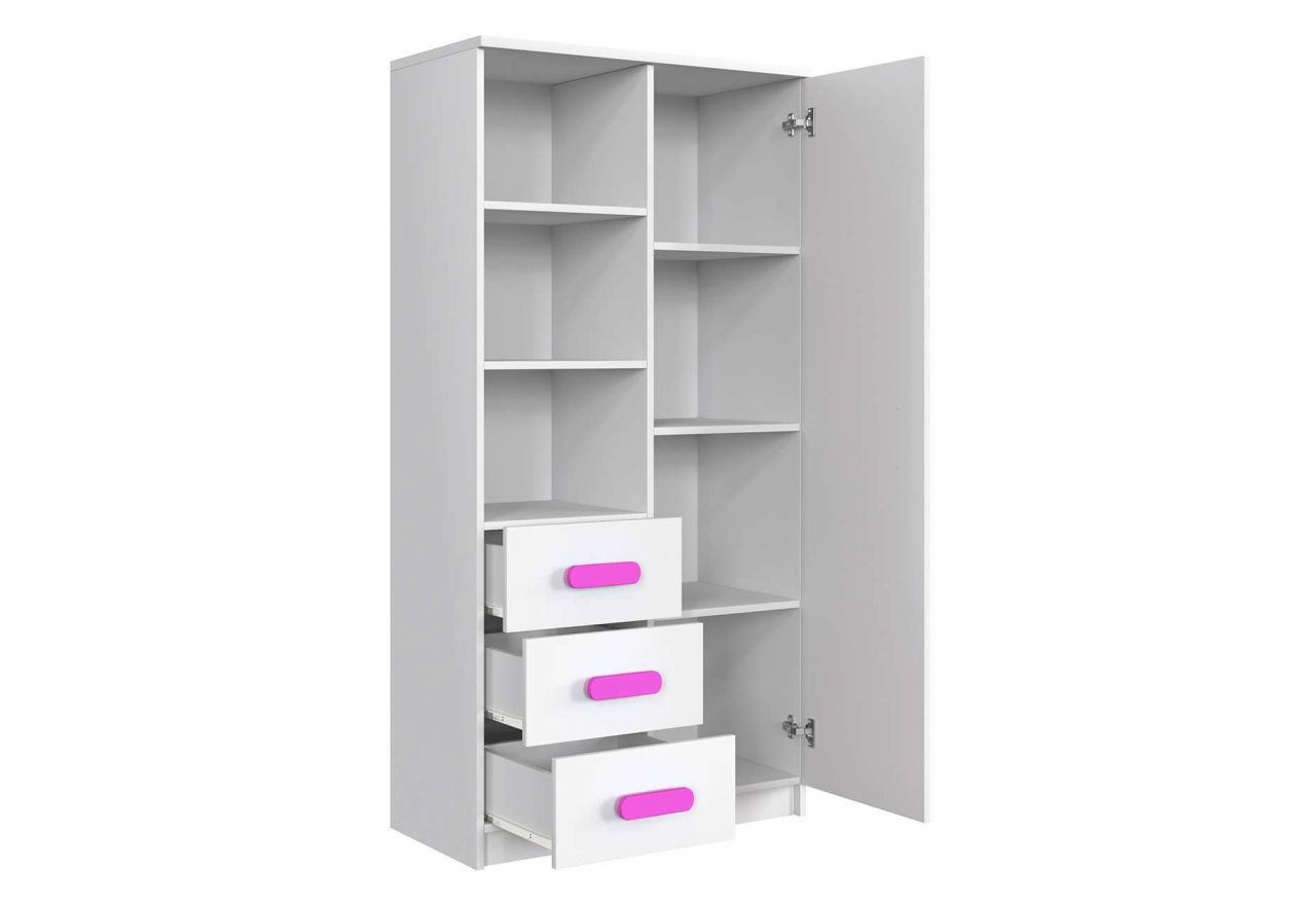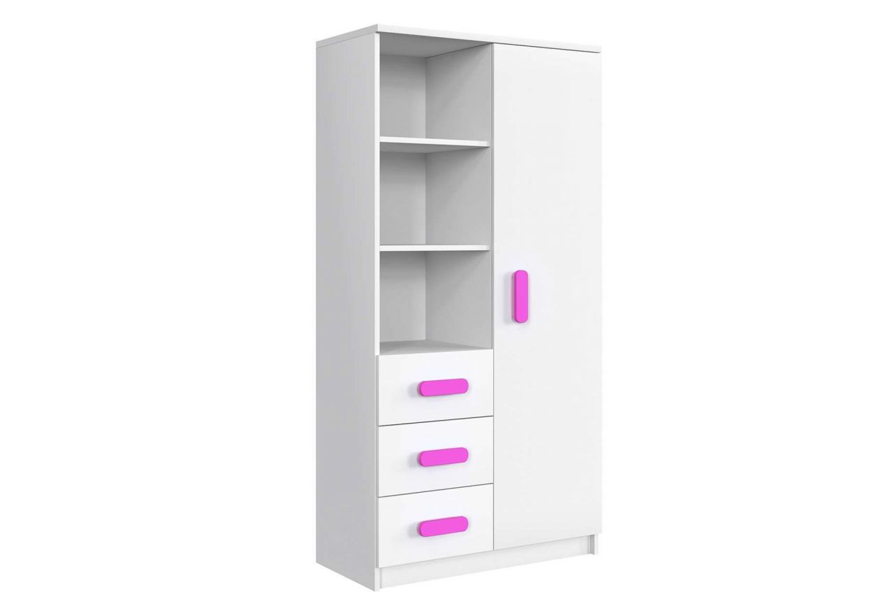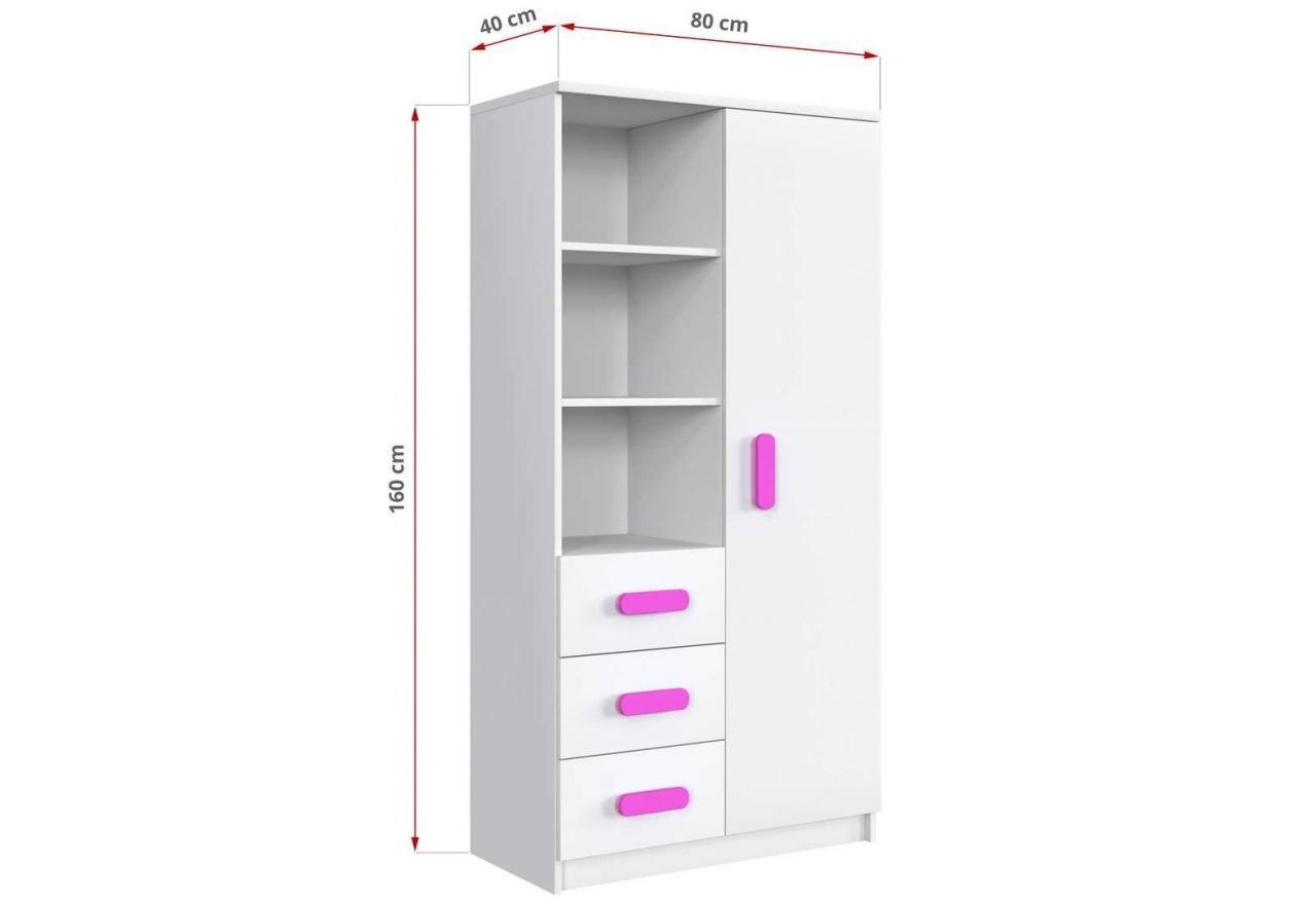 Duży regał z szufladami to mebel, który powinien się znaleźć w pokoju dziecka. Dlaczego? Głębokie i pojemne półki oraz szuflady zmieszczą bardzo dużo rzeczy, które nie mogą pomieścić się gdzieś indziej! Jeśli nie masz szafy w pokoju, regał KIDS będzie odpowiednim miejscem na przechowanie ubrań! Charakterystyczne uchwyty to element rzucający się na pierwszy rzut oka. Kolory wyróżniają się na tle jasnych mebli. Materiały wykorzystane do stworzenia mebli są z wyselekcjonowanej, wysokiej jakości płyty laminowanej 16 mm, która gwarantuje odporność na zarysowania, uszkodzenia oraz wilgoć. Okucia łączące elementy są wysokogatunkowe, więc masz pewność, że meble będą wieloletnie. Dla zwiększenia wytrzymałości i trwałości mebla, obrzeża mebli wykończono okleiną ABS. Stwórz dla swojego dziecka doskonałą kompozycję z kolekcją KIDS!