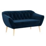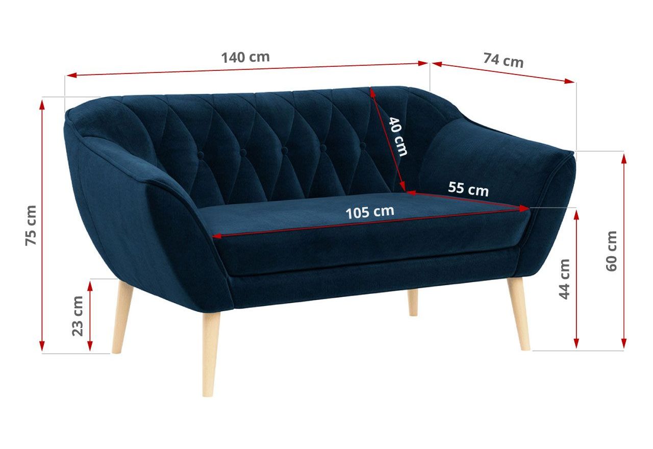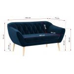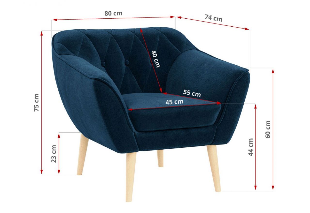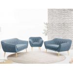 Nowoczesny zestaw wypoczynkowy składa się z sofy trzyosobowej, sofy dwuosobowej oraz fotela. Prezentowane meble charakteryzują się doskonałą trwałością, która wynika z wykorzystanych do produkcji najlepszych materiałów, takich jak drewno bukowe, które stanowi podstawę solidnego stelażu. W każdym produkcie łączy się on z falistymi sprężynami oraz pianką T30, co zapewnia nie tylko wytrzymałość, lecz także wysoki poziom komfortu. Meble wchodzące w skład ciemnoniebieskiego zestawu wypoczynkowego wyposażone zostały również w drewniane nóżki (23 cm), które podkreślają zgodność ze skandynawskim stylem wystroju wnętrz. Obicia oraz siedziska prezentowanych produktów są stałe i tapicerowane.