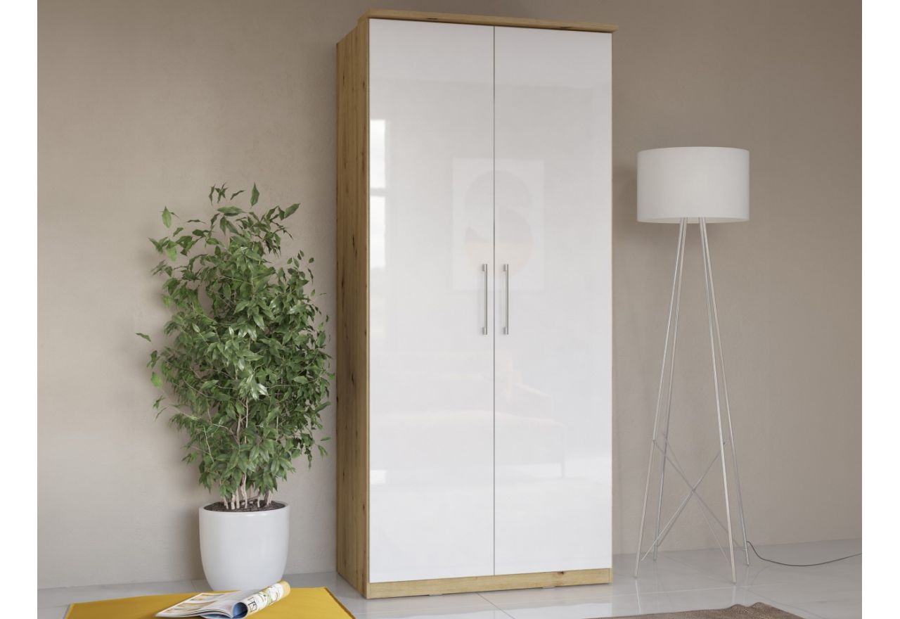 Dwudrzwiowa szafa 90 cm w modnym stylu do sypialni i garderoby - OLIVER Dąb Artisan / Biały połysk