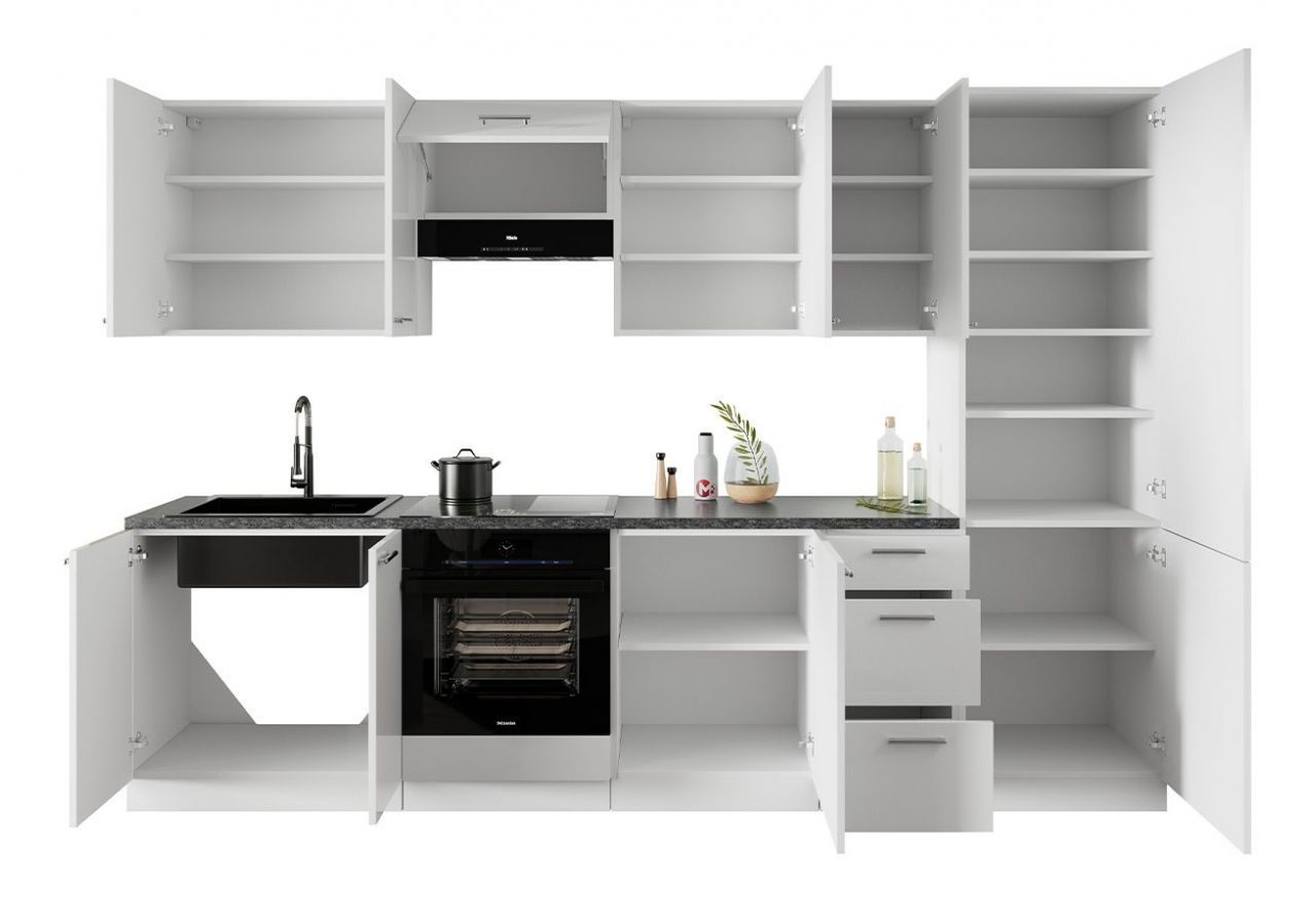 Rozbudowany zestaw mebli kuchennych z frontami w białym połysku LAUREN WHITE 300 cm - Biały połysk / Biały mat